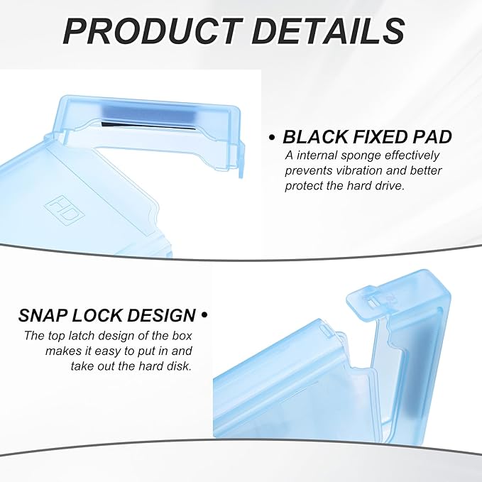 - Advantage: Portable case is made of plastic and is resistant to impact, scratches, static electricity, moisture, and dust, ensuring long-term use. The top latch design of the box makes it easy to put in and take out the hard disk, a internal sponge effectively prevents vibration and better protect the hard drive.