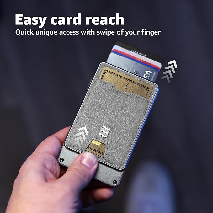 RFID Blocking Wallet, Minimalist Card Holder with Quick Access, Holds 1 to 12 Cards & Cash, Vegan Leather & Brushed Aluminum, Gift-Ready Packaging (Gray)