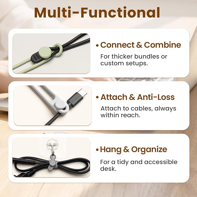 - ✅【Compact & Anti-Loss】These wire organizers for cords are compact and lightweight, making it easy to carry in bags for travel, school, or daily use. The round hole on the top can be securely attached to cables to prevent loss, and also enables hanging up bundled items to save more space.