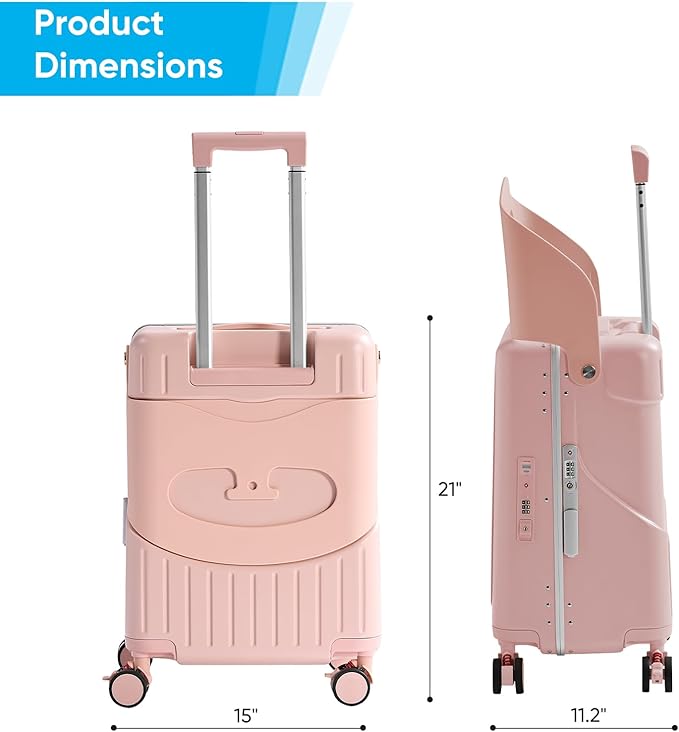 20 Inch Ride on Luggage With Seat For Kids&Adults,with Front Pocket, Foldable Seat Back TSA Approved Lock, 360° Spinner Wheels(20 inch,Pink)