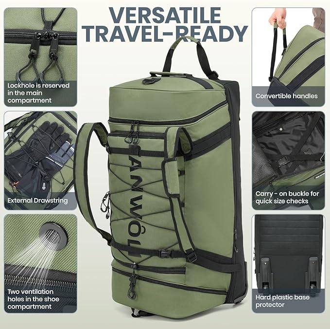 Fanwoli 92L 120L Large Rolling Duffle Bag with Shoes Compartment, 30’’ Expandable & Foldable Heavy Duty Water Resistant Travel Backpack, Convertible Foldable Duffel for Gym Camping Weekender