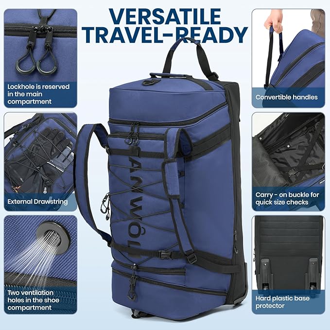 - Versatile & Travel-Ready:This well-designed travel bag features two ventilation holes in the shoe compartment prevent odors and keep contents clean.An airline-compliant carry-on buckle for quick size checks. The exterior includes reinforced cross-strapping for secure roll-up storage, while convertible handles (hand-carry or shoulder-strap) adapt to any trip. The main zipper has a lockable pull for added security. Designed for smart and flexible packing, it combines functionality with ease of use