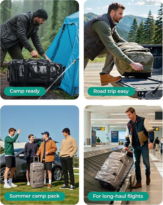 - Built Large, Built Tough: 70L large capacity, 27.2 * 13.4 * 11 inches, comparable to a 26-inch suitcase. Crafted from water-resistant, tear-proof material, this large rolling duffle bag is designed to handle rough travel, outdoor trips, and years of frequent use