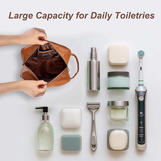 - Portable design: Leather handle makes the Dopp kit for toiletries easier and comfortable to carry and hang, reinforced bottom with leather makes it wearable. The combination of zipper & zipper ear makes it easier to hold and zip up and down. This toiletry bag is in a perfect size that can be packed up and tucked away in the suitcase