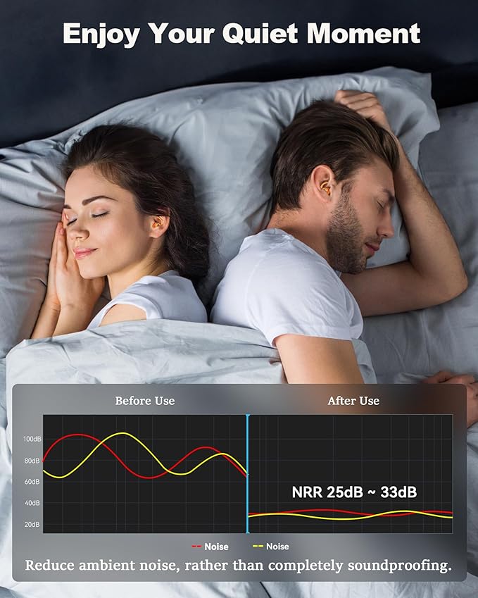 - Effective Noise Reduction: The ear plugs noise reduction have different noise-cancelling effects in different scenes (NRR 25dB to 33dB),soften the sound source and reduce noise while preserving the sound clarity and sharpness. These comfortable ear plugs for sleeping help preserve your hearing and provide you with some peace in a noisy world.