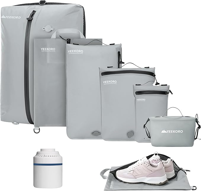 - 【Material Construction】4 travel airtight compression bags: Adopt a dual-layer protective structure, made of 40D nylon fabric combined with single-layer 8-micron TPU. Equipped with IPX8 waterproof zippers for 100% waterproof performance; Toiletry bag: Crafted from 40D nylon; Shoe bag: Made of 230T polyester grid PU fabric (non-waterproof), featuring excellent abrasion resistance, tear strength, reinforced corners and load-bearing handles