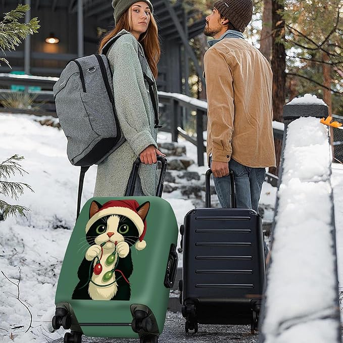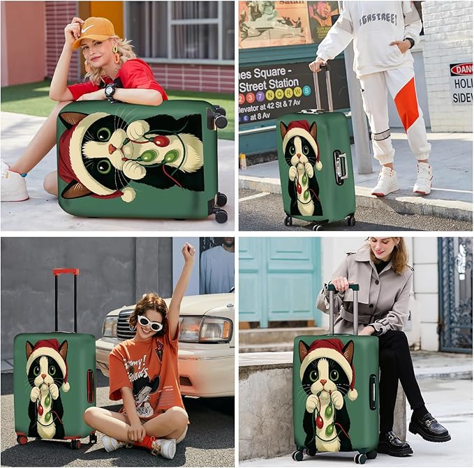 ANNA QUEEN Christmas Cat Luggage Cover, Cute Santa Cat with Light String Suitcase Protector, Stretchable Washable Travel Sleeve for 28-30 Inch Luggage