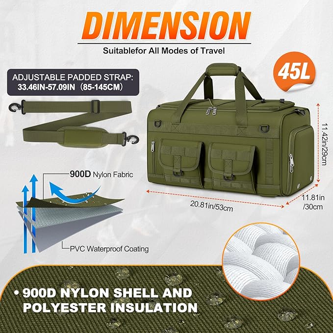 - 【3-IN-1 VERSATILE GYM BAG】Engineered for maximum adaptability, this rugged gym bag transforms seamlessly between 3 carry modes: a comfortable tactical backpack, a practical shoulder duffle bag, and a sturdy carry-handle gym sport bag. Includes an adjustable shoulder strap (33.5"-57") for a customized, secure crossbody fit. Its stylish unisex design with MOLLE webbing offers both superior style and functionality for gym, travel, work, or any active lifestyle.