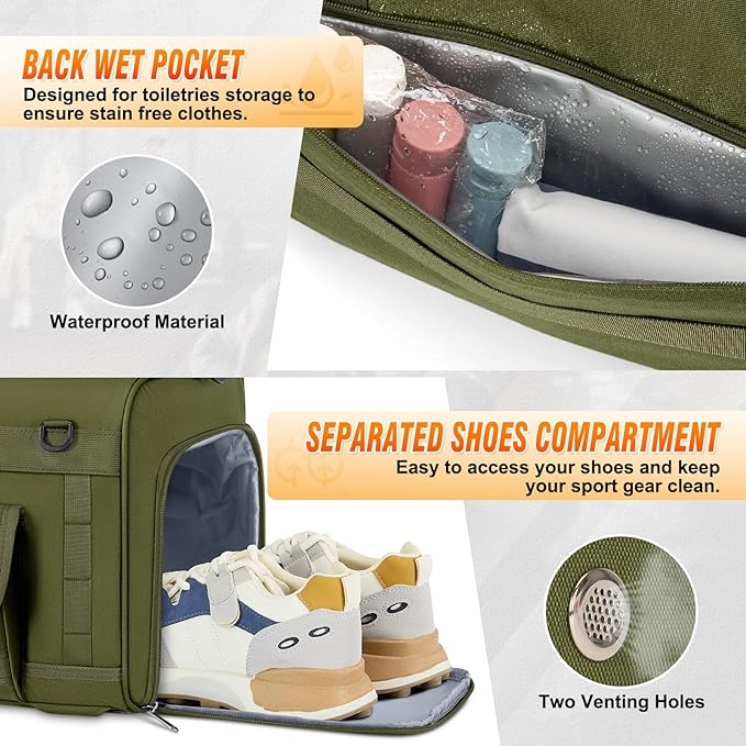 RAINSMORE Gym Bag for Men, 45L Sports Duffel Bag with Shoe Compartment Gym Backpack Carry On Weekender Bag Overnight Backpack Carry On,Green