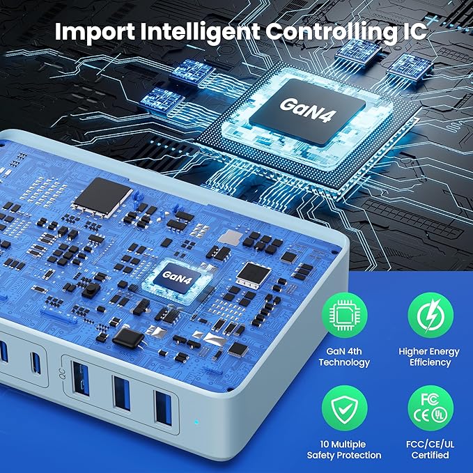 - 【Latest GAN Ⅳ Chip Technology Charger Station】The USB C charger adapted GaN Ⅳ generation chip technology, built-in multi-protection system and premium microchips. With higher energy efficiency, higher resistance to radiation and upgraded heat dissipation, Gallium Nitride (GaN) makes our chargers smaller and safer without sacrificing a drop of power. Trustworthy Charging Station with 3 Years Warranty!