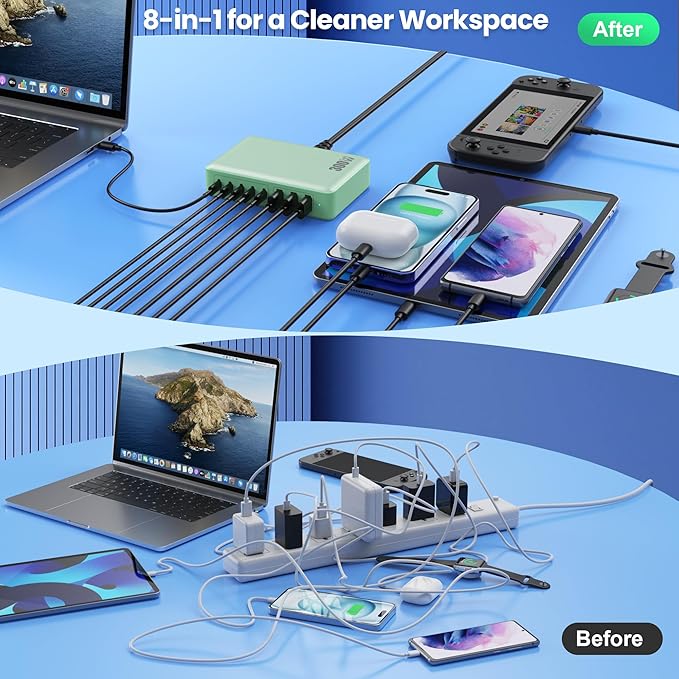 - 【300W Super Fast 8-in-1 Usb C Charger Block】Our USB charger provides multi charging options to meet your different needs. With 5*USB C ports and 3*USB A ports, no need for more adapters, you can use just one outlet to plug in laptops, tablets, smartphones, Bluetooth speakers and other small gadgets like earbuds, smartwatches, game consoles etc.Our USB C charging stations feature 8 independent output ports, ensuring all devices can charge simultaneously at full speed without power sharing and disconnection,this 8-in-1 charging station will reduce your accessories burden and help you create an organized and clean desktop.