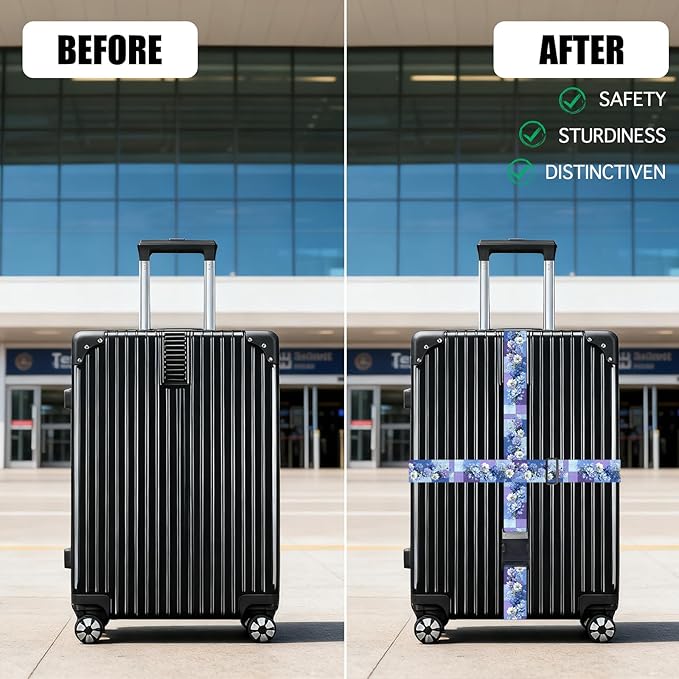 Nuxovilar Luggage Straps of 2 Set Blue & Purple Flowers Pattern, 1.96x90.5 inches - Luggage Straps for Suitcases, Nice for Travel, Weekend Trips, Vacations