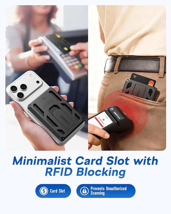 - 【All-in-One Design】Stop juggling multiple gadgets! VEGER versatile 6-in-1 portable phone charger combines a 20W USB-C wired fast charging for Android and iPhone, a 15W magnetic wireless charger, a multi-angle phone stand, a secure RFID-blocking wallet, and a built-in global GPS tracker. It measures 3.85 x 2.7 x 0.58 inches and weighs only 5.43 ounces. Designed for a minimalist lifestyle, it consolidates your essentials into one sleek device to reduce clutter and keep you prepared anywhere.