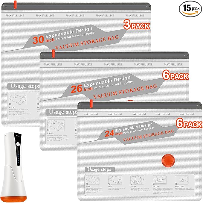 - 3 sizes of storage bags - Includes 6 x 29" (small), 6 x 34" (medium), 6 x 39" (large) vacuum-sealed bags for storing clothes, towels, pillows, comforters, or travel essentials. The versatile sizes are perfect for suitcases, closets, and home organization.