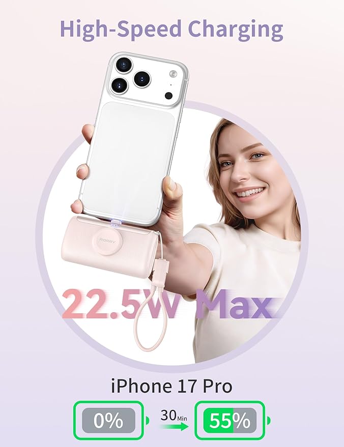 - 10,000mAh Massive Capacity: Never worry about running out of juice. Despite its mini size, RORRY portable power bank's 10,000mAh cell offers up to 1.8 charges for an iPhone 16 Pro and an astonishing 20 charges for an Apple Watch Series 10, keeping you powered all day.