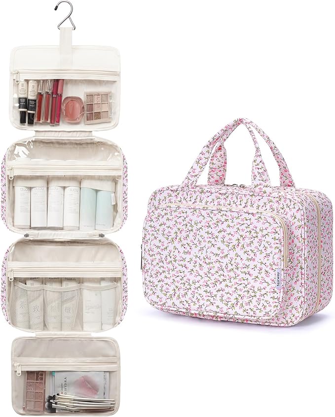 Narwey Travel Toiletry Bag for Women Large Hanging Makeup Bag Organizer Toiletries Bag for Full Size Essentials Accessories Cosmetics (Green Leaves and Flower (Large))