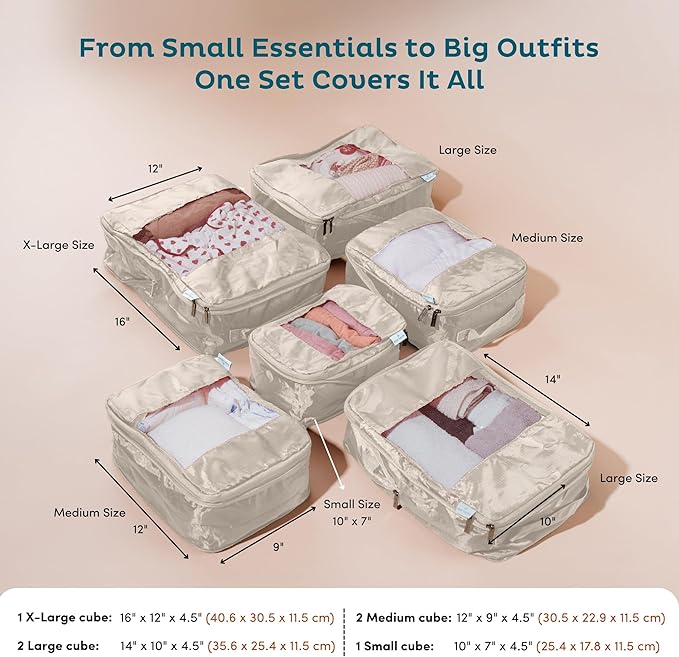 - Your Ultimate Travel Organizer - 6 lightweight, compressible packing cubes for travel keep outfits, underwear and accessories neat. Ideal luggage packing cubes for travel, weekend getaways, road trips or daily suitcase organization.