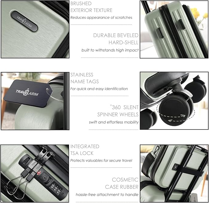 TravelArim 22 Inch Carry On Luggage 22x14x9 Airline Approved, Small Carry On Suitcase, Hard-shell Carry-on Luggage with Wheels, Durable Sage Green Luggage Carry-On with Cosmetic Case and Luggage Scale