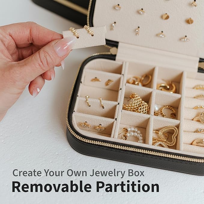 - Elegantly Customizable: Jewelry case for traveling which includes five loops for your bracelets and necklaces, two earring cards with twenty holes, an elastic pocket for chains, six ring slots and two removable dividers to meet different needs
