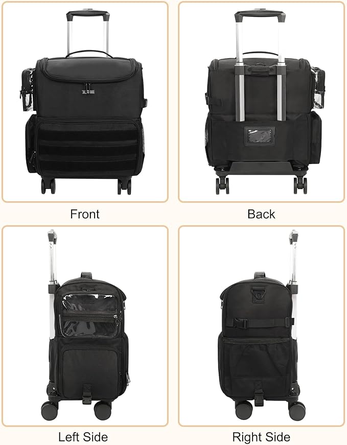 - Professional Makeup Rolling Case: The rolling makeup case size 14'' x 8.6''x 15'' (L x W x H). Large capacity holds all essentials for makeup artists, manicurists, barbers, hairstylists, beauticians, tattooists, and face painters. Ideal for studio shoots, location makeup, weddings, and more.
