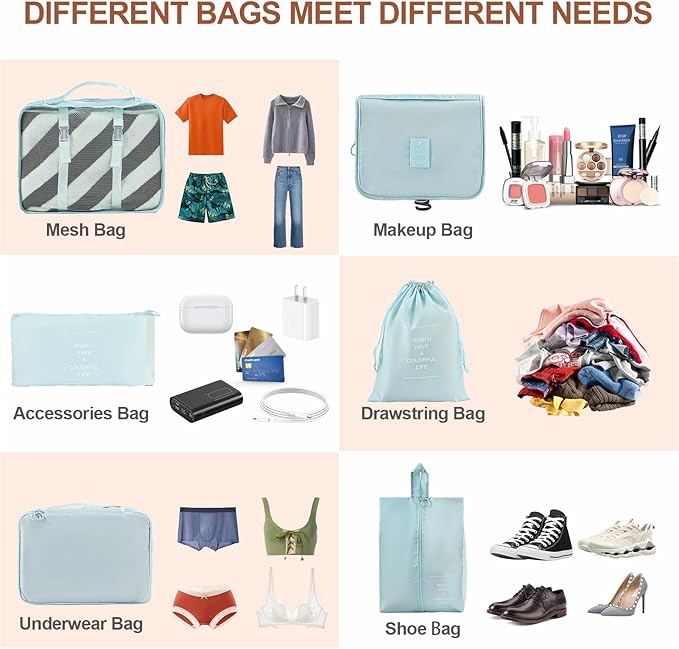 - Organized Packing and Space Saving:This 8 set packing cubes set offers multiple sizes to separate your clothing and accessories, maximizing luggage space. Available in vibrant colors like navy, blue, pink, and beige, these cubes help keep your items organized, making packing and unpacking faster and more efficient, while also preventing misplaced items.