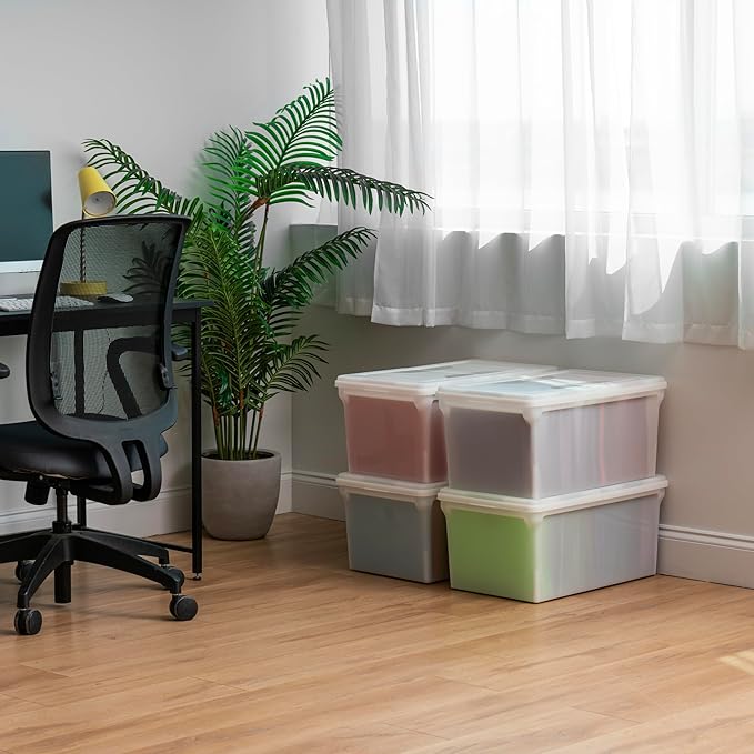 IRIS USA File Box, File Organizer w/Hinged Split Lid for Letter File, Important Document Box, Plastic Storage Filing Bin for Moving, Stackable Nestable Portable, Pearl 44 Qt. 4 Pack