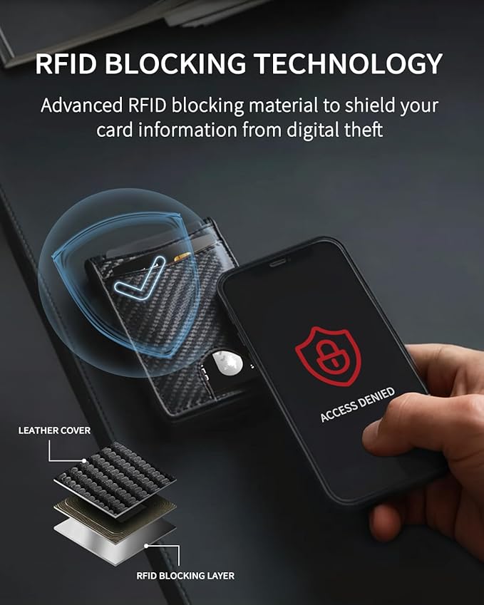 - ADVANCED RFID BLOCKING SECURITY:The RFID wallet features a built-in chip that effectively blocks 13.56 MHz high-frequency signals, preventing unknown scanning devices from accessing your personal information. It safeguards your ID card, credit cards and passport, making it the ideal companion for commuting and travel.