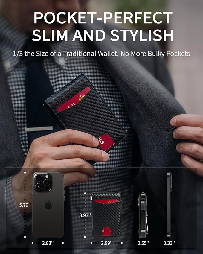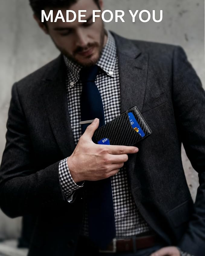 - SLIM BODY&LARGE CAPACITY:This slim wallet for men holds 11-13 cards, with aluminum card slots accommodating 6-8 cards and a leather flap featuring 3-5 additional card slots. It includes a transparent ID window and a bill compartment. Its ultra-slim design ensures it fits effortlessly into front pockets without bulging, even when fully loaded.