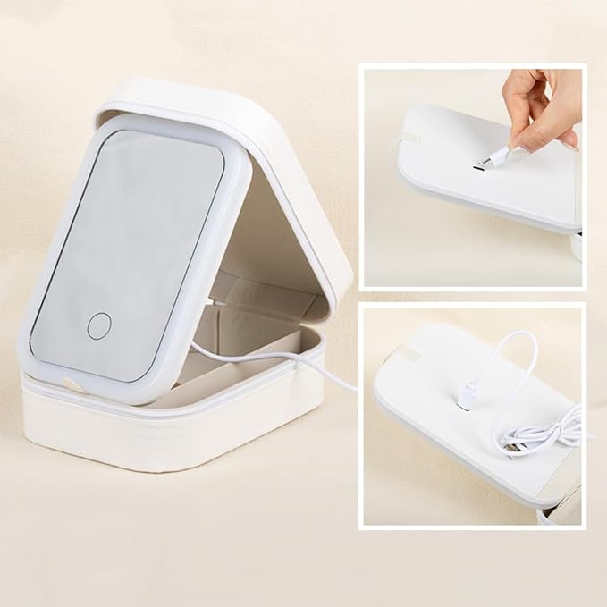 - LED Mirror with 3 Adjustable Light Settings: Features a clear LED mirror that has 3 adjustable color settings—warm, natural, and cool light. The travel jewelry organizer comes with a USB charging cable, and a single charge can last for about a week